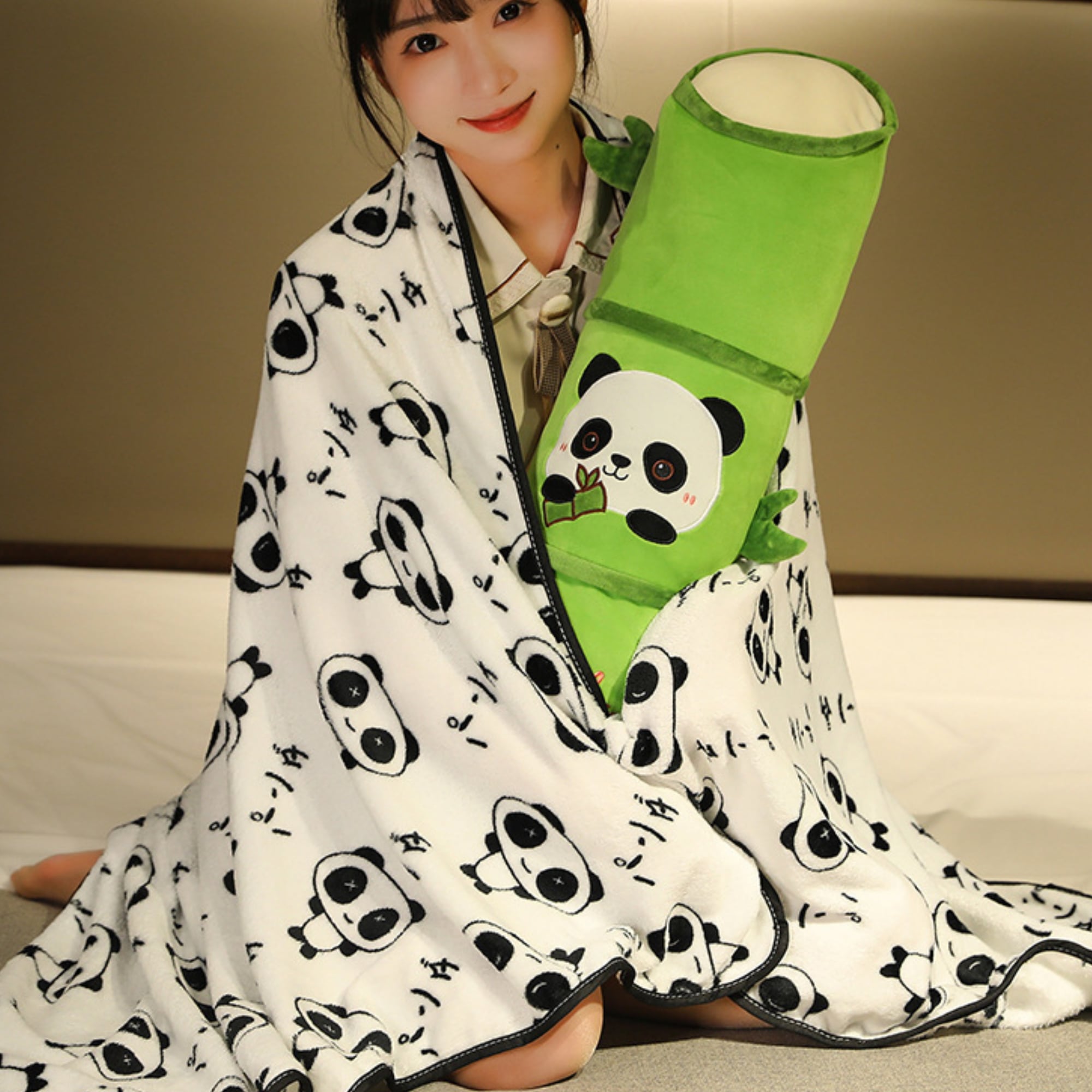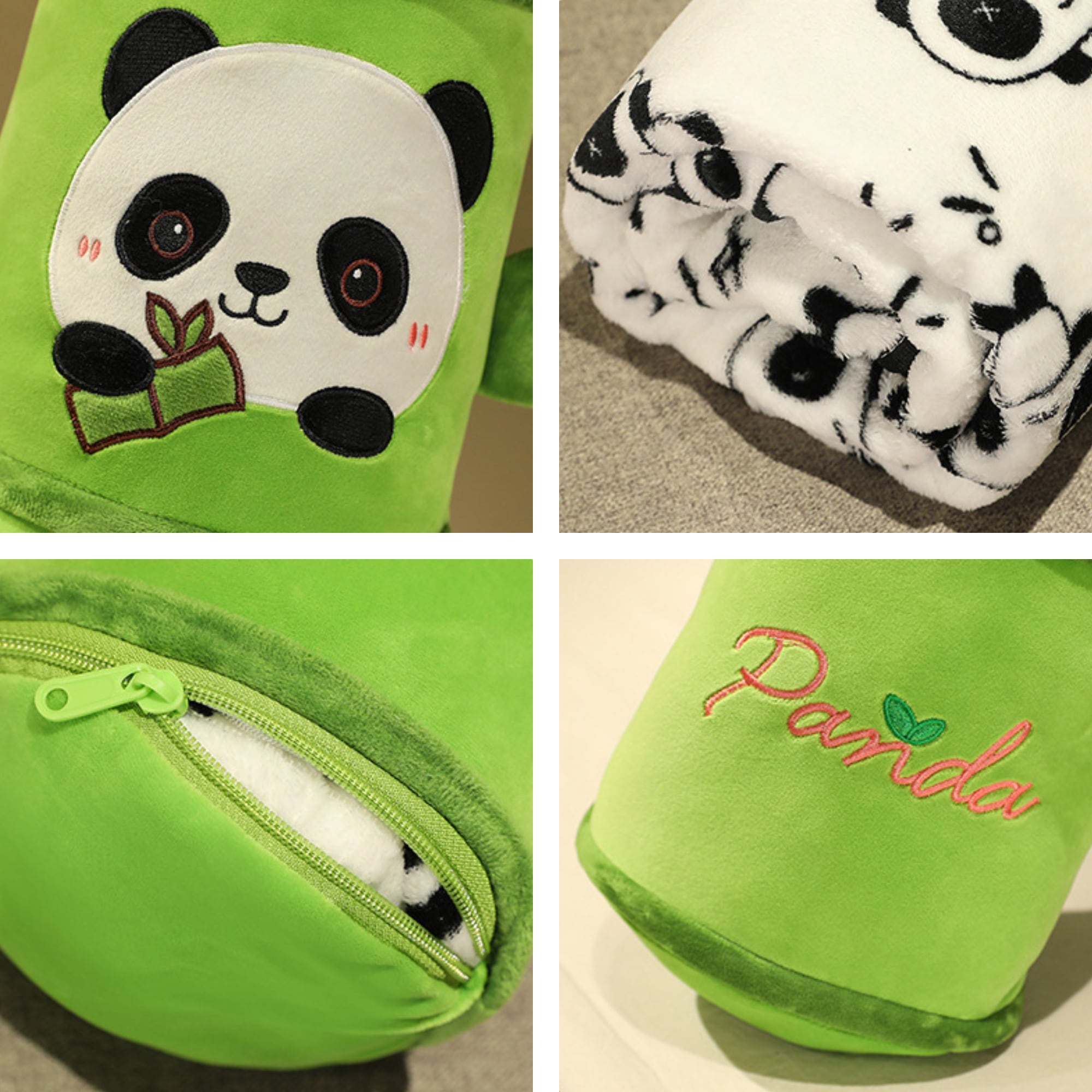筒状の竹デザインのピロー(枕)の中に、パンダ柄のブランケットを収納できるセットアイテム。