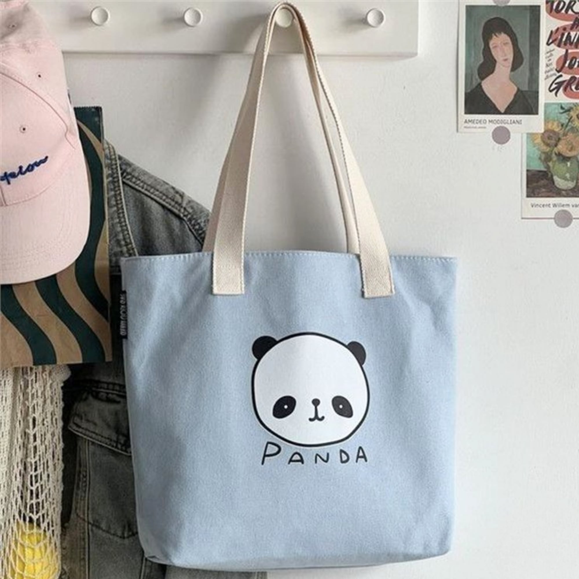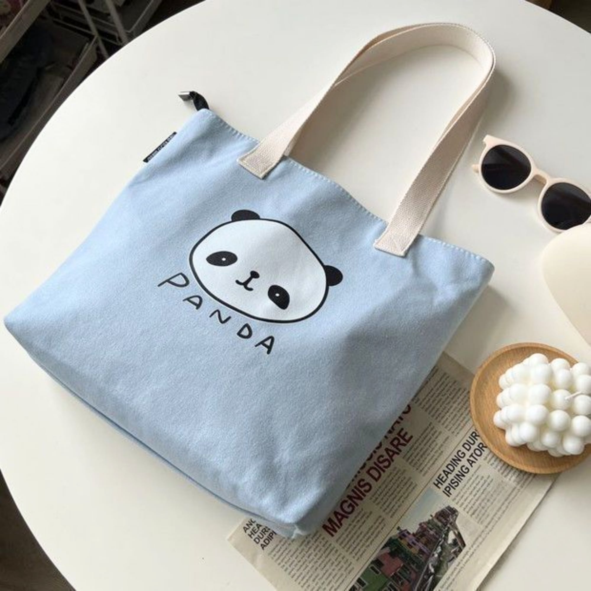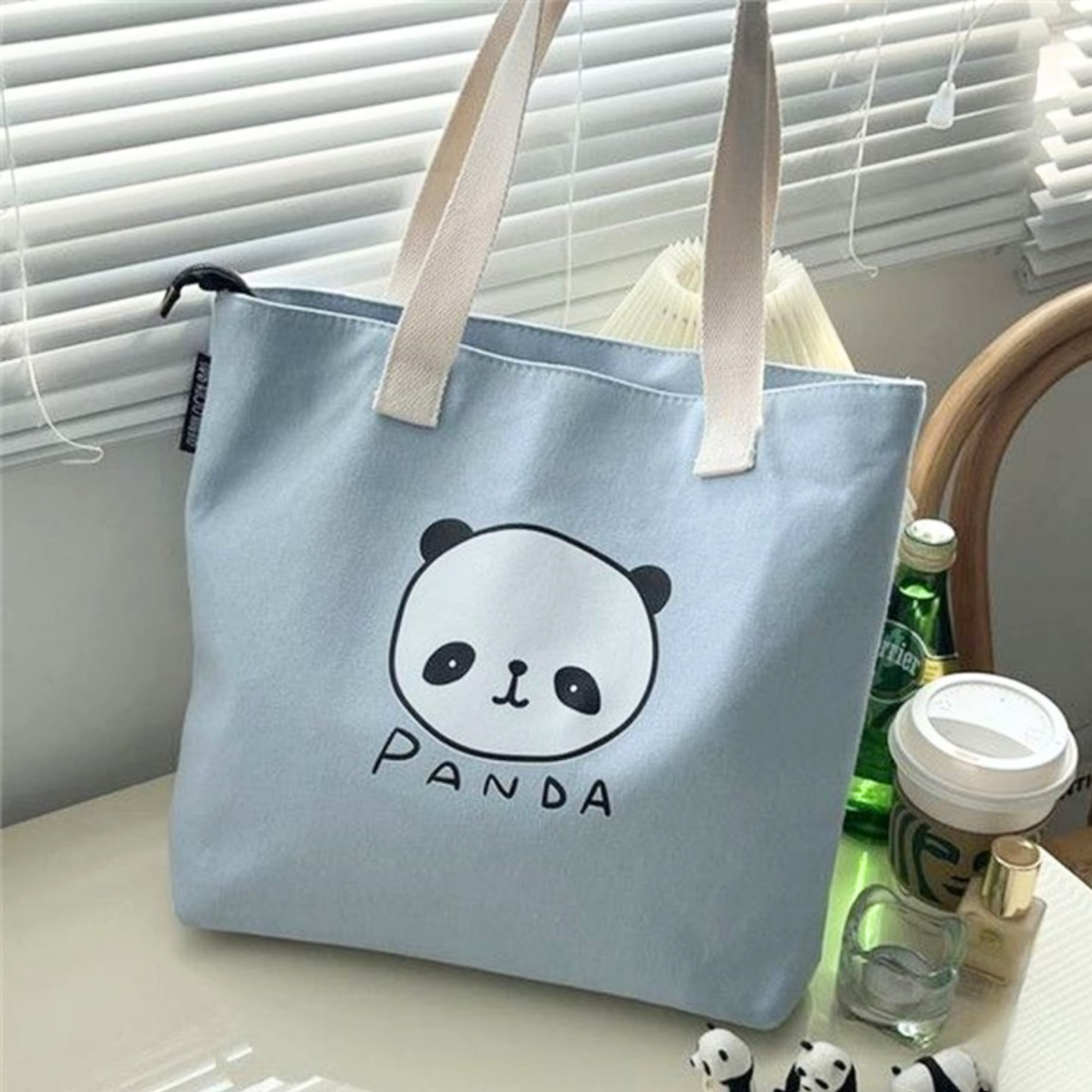 パステルブルーの帆布生地にゆるかわのパンダイラストがベストマッチのトートバッグ。